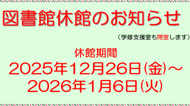 2025年12月26日(金)~2026年1月6日(火)は、年末年始のため休館となります。